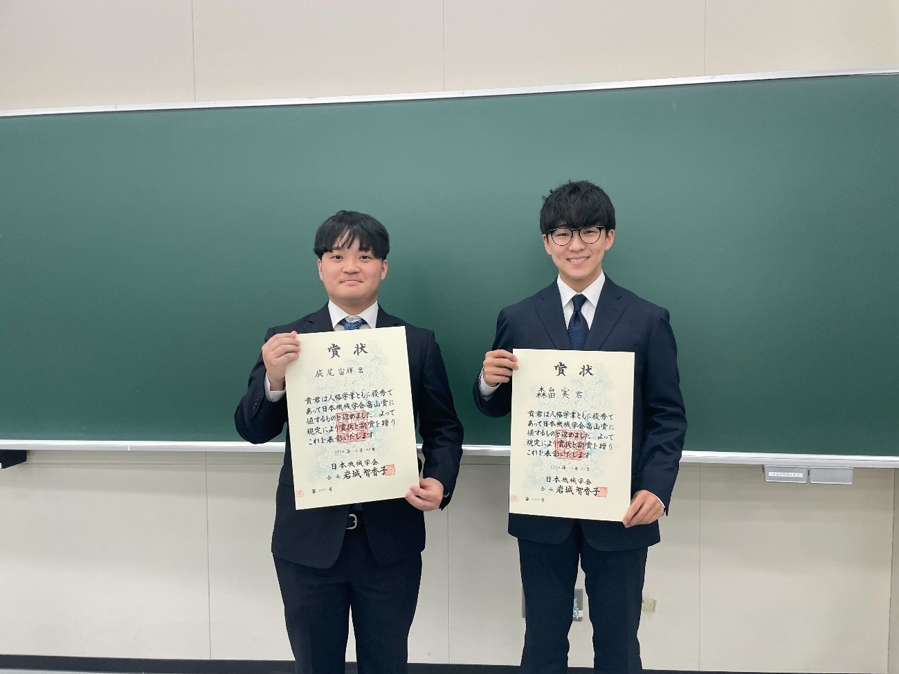 山根研究室B4の成尾宙輝さん、森畠実さんと王研究室B4の熊谷佑希さんが日本機械学会・畠山賞を受賞しました! 2026 3/23 記事・その他紹介 2026年3月23日 立命館大学理工学部機械工学科の山根研究室学部4回生の成尾 宙輝さん、森畠 実さんとロボティクス学科の王研究室の学部4回生の熊谷佑希さんが、日本機械学会の畠山賞を受賞しました。おめでとうございます! 成尾宙輝さんと森畠実さんの受賞写真 Tweet 記事・その他紹介 よかったらシェアしてね! URLをコピーしました! URLをコピーしました! 立命館大学 機械工学科 材料科学研究室の4回生の濱田 拓治さんが日本材料学会 第20回若手シンポジウムにおいて優秀発表支部長賞を受賞されました! 関連記事 立命館大学 機械工学科 材料科学研究室の4回生の濱田 拓治さんが日本材料学会 第20回若手シンポジウムにおいて優秀発表支部長賞を受賞されました! 2026年2月13日 国際シンポジウムSII 2026にて加古川研究室M2の廣本翔太君がSIYA-SII2026 Paper Award を受賞しました! 2026年1月26日 2025年度粉体粉末冶金協会・秋季大会において立命館大学 理工学研究科の学生2人が「優秀講演発表賞」を受賞しました 2026年1月13日 「第10回滋賀テックプラングランプリ」にて理工学部の吉岡修哉 准教授が受賞しました。 2025年11月18日 池田英一郎様 ご逝去のご報告 2025年9月6日 山根大輔アソシエイトフェロのチームがディープテックグランプリ2024で最優秀賞を受賞しました。 2024年9月18日 機械システム系 卒業・修了記念パーティーが開催されました 2024年3月25日 徳田研究室の学生2名が学会で賞を受賞しました 2024年3月15日